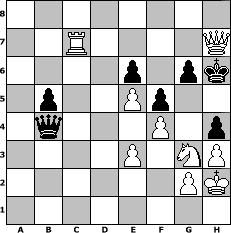 Partie-Notation im PGN-Format [Event "Prätorianer"] [Site "www.mySchach.de"] [Date "2023.01.04"] [Round "1"] [White "beowulf"] [Black "Achimkogge"] [ECO "A03"] [WhitemyELO "1407"] [BlackmyELO "1307"] [Result "1-0"] [TimeControl "10/1728000"] [WhiteDays "20"] [BlackDays "20"] [MySchachNr "128885"] 1. f4 d5 2. Nf3 Nc6 3. b3 Bf5 4. Bb2 Nf6 5. e3 Bg4 6. h3 Bh5 7. Bb5 a6 8. Be2 Ne4 9. O-O Ng3 10. Re1 e6 11. Kh2 Ne4 12. d4 Nf2 13. Qc1 f6 14. Nbd2 h6 15. c4 f5 16. Ne5 Nxe5 17. dxe5 Bxe2 18. Rxe2 Nd3 19. Qc2 Nxb2 20. Qxb2 Bc5 21. cxd5 Qxd5 22. Nf1 O-O 23. Rd2 Qc6 24. Rad1 Bb4 25. Rd7 a5 26. a3 Bc3 27. Qc1 b5 28. b4 axb4 29. axb4 Ra2 30. R7d2 Rxd2 31. Rxd2 Kh7 32. Rc2 Qc4 33. Rxc3 Qxb4 34. Rxc7 h5 35. Qd1 Kh6 36. Ng3 g6 37. Qd7 Rf7 38. Qxf7 h4 39. Qh7# 1-0 Stellungs-Notation im FEN-Format 8/2R4Q/4p1pk/1p2Pp2/1q3P1p/4P1NP/6PK/8 - - - 1 39 Geschlagene Figuren Weiss: ![]() ![]() ![]() ![]() ![]() ![]() ![]() ![]() ![]() ![]() ![]() ![]() ![]() ![]() ![]() Geschlagene Figuren Schwarz: ![]() ![]() ![]() ![]() ![]() ![]() ![]() ![]() ![]() ![]() ![]() ![]() ![]() ![]() ![]() Klicken Sie auf eine geschlagene Figur um den gewünschten Zug darzustellen!