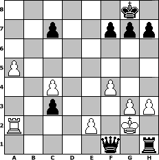 Partie-Notation im PGN-Format [Event "#2"] [Site "www.mySchach.de"] [Date "2015.01.20"] [Round "1"] [White "borsti"] [Black "Knight"] [ECO "C62"] [WhitemyELO "1355"] [BlackmyELO "1316"] [Result "0-1"] [TimeControl "10/1728000"] [WhiteDays "80"] [BlackDays "80"] [MySchachNr "97773"] 1. e4 e5 2. Nf3 Nc6 3. Bb5 d6 4. d3 Nf6 5. Bg5 Be7 6. Bxc6+ bxc6 7. Nc3 Bg4 8. h3 Be6 9. O-O O-O 10. Be3 d5 11. a4 d4 12. Nxe5 dxc3 13. bxc3 Bd7 14. c4 a5 15. Rb1 Bb4 16. Bd4 c5 17. Nxd7 Qxd7 18. Ra1 cxd4 19. Ra2 Rfe8 20. Re1 Bxe1 21. Qxe1 Rab8 22. Qxa5 Rb1+ 23. Kh2 Qd6+ 24. g3 Rf1 25. Qf5 Qb4 26. a5 Qe1 27. Qf3 Nxe4 28. dxe4 Rxe4 29. c3 dxc3 30. Kg2 Rh1 31. Qxe4 Qxe4+ 32. f3 Qe1 33. f4 Qf1# 0-1 Stellungs-Notation im FEN-Format 6k1/2p2ppp/8/P7/2P2P2/2p3PP/R3P1K1/5q1r - - - 1 34 Geschlagene Figuren Weiss: Geschlagene Figuren Schwarz: Klicken Sie auf eine geschlagene Figur um den gewünschten Zug darzustellen!