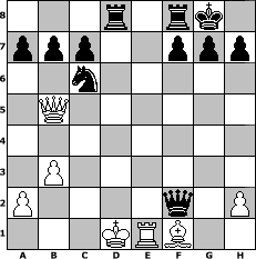 Partie-Notation im PGN-Format [Event "Thema-2016-02"] [Site "www.mySchach.de"] [Date "2016.02.10"] [Round "1"] [White "Caligula"] [Black "ChNe"] [ECO "C33"] [WhitemyELO "1299"] [BlackmyELO "1526"] [Result "0-1"] [TimeControl "10/2592000"] [WhiteDays "30"] [BlackDays "23"] [MySchachNr "102471"] 1. e4 e5 2. f4 exf4 3. b3 Qh4+ 4. Ke2 Qe7 5. d3 d5 6. Bxf4 Bg4+ 7. Nf3 Bxf3+ 8. gxf3 Qf6 9. Nd2 Qxf4 10. Qe1 Bb4 11. Kd1 Bxd2 12. Qxd2 Qxf3+ 13. Kc1 Qxh1 14. Kb2 Qf3 15. exd5 Qf6+ 16. d4 Ne7 17. Qd3 O-O 18. c3 Nxd5 19. Re1 Nc6 20. Qb5 Nxc3 21. Kxc3 Qxd4+ 22. Kc2 Qf2+ 23. Kd1 Rad8+ 0-1 Stellungs-Notation im FEN-Format 3r1rk1/ppp2ppp/2n5/1Q6/8/1P6/P4q1P/3KRB2 - - - 4 24 Geschlagene Figuren Weiss: Geschlagene Figuren Schwarz: Klicken Sie auf eine geschlagene Figur um den gewünschten Zug darzustellen!