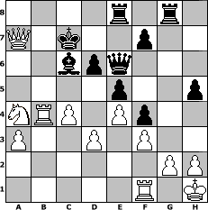 Partie-Notation im PGN-Format [Event "Frohes Fest und spannende Spiele"] [Site "www.mySchach.de"] [Date "2018.12.21"] [Round "1"] [White "augustus"] [Black "Hobbykegler"] [ECO "C20"] [WhitemyELO "1072"] [BlackmyELO "994"] [Result "1-0"] [TimeControl "10/864000"] [WhiteDays "22"] [BlackDays "08"] [MySchachNr "113808"] 1. e4 e5 2. d3 Nc6 3. Nh3 Nf6 4. c3 Qe7 5. Bg5 h6 6. Bh4 g5 7. Bg3 b6 8. f3 Ba6 9. Be2 Qe6 10. O-O Bc5+ 11. Kh1 d6 12. c4 b5 13. b3 Nd4 14. Nc3 b4 15. Na4 Nxe2 16. Qxe2 O-O-O 17. Bf2 Bxf2 18. Qxf2 Rhg8 19. Qxa7 Bb7 20. Qa5 Nh5 21. Qxb4 c5 22. Qa5 Rde8 23. a3 Nf4 24. Nxf4 gxf4 25. Rab1 h5 26. b4 cxb4 27. Rxb4 Bc6 28. Qa6+ Kc7 29. Qa7+ 1-0 Stellungs-Notation im FEN-Format 4r1r1/Q1k2p2/2bpq3/4p2p/NRP1Pp2/P2P1P2/6PP/5R1K - - - 4 29 Geschlagene Figuren Weiss: ![]() ![]() ![]() ![]() ![]() ![]() ![]() ![]() ![]() ![]() ![]() ![]() ![]() ![]() ![]() Geschlagene Figuren Schwarz: ![]() ![]() ![]() ![]() ![]() ![]() ![]() ![]() ![]() ![]() ![]() ![]() ![]() ![]() ![]() Klicken Sie auf eine geschlagene Figur um den gewünschten Zug darzustellen!
