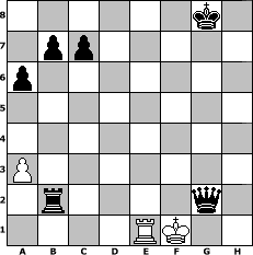 Partie-Notation im PGN-Format [Event "Wer Spanisch spielen kann, kann Schach spielen!"] [Site "www.mySchach.de"] [Date "2009.12.04"] [Round "1"] [White "babikar"] [Black "Jolilein"] [ECO "C68"] [WhitemyELO "1286"] [BlackmyELO "1886"] [Result "0-1"] [TimeControl "10/864000"] [WhiteDays "22"] [BlackDays "25"] [MySchachNr "61221"] 1. e4 e5 2. Nf3 Nc6 3. Bb5 a6 4. Bxc6 dxc6 5. Nxe5 Qd4 6. Nf3 Qxe4+ 7. Kf1 Bg4 8. d3 O-O-O 9. h3 Bxf3 10. Qxf3 Qxf3 11. gxf3 Ne7 12. Bf4 Ng6 13. Be3 Be7 14. Nc3 Nh4 15. Ne4 Nxf3 16. Ke2 Nd4+ 17. Bxd4 Rxd4 18. Rhg1 f5 19. Ng3 g6 20. Ke3 Rh4 21. Rh1 f4+ 22. Kf3 fxg3 23. fxg3 Rh5 24. Rae1 Rf5+ 25. Kg2 Bc5 26. Rhf1 Rxf1 27. Rxf1 Re8 28. Rf4 Re2+ 29. Kf1 Rxc2 30. d4 Bb6 31. Rf8+ Kd7 32. Rf7+ Ke6 33. Rxh7 Rxb2 34. Rh6 Kf6 35. a3 Bxd4 36. Rh7 Be5 37. g4 c5 38. h4 Ke6 39. h5 c4 40. hxg6 c3 41. g7 Kf7 42. g8=Q+ Kxg8 43. Re7 c2 44. Rxe5 c1=Q+ 45. Re1 Qf4+ 46. Kg1 Qxg4+ 47. Kf1 Qg2# 0-1 Stellungs-Notation im FEN-Format 6k1/1pp5/p7/8/8/P7/1r4q1/4RK2 - - - 2 48 Geschlagene Figuren Weiss: ![]() ![]() ![]() ![]() ![]() ![]() ![]() ![]() ![]() ![]() ![]() ![]() ![]() ![]() ![]() Geschlagene Figuren Schwarz: ![]() ![]() ![]() ![]() ![]() ![]() ![]() ![]() ![]() ![]() ![]() ![]() ![]() ![]() ![]() Klicken Sie auf eine geschlagene Figur um den gewünschten Zug darzustellen!