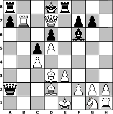 Partie-Notation im PGN-Format [Event "Rechnerfrei A"] [Site "www.mySchach.de"] [Date "2010.02.05"] [Round "1"] [White "Haneken"] [Black "fred521"] [ECO "A04"] [WhitemyELO "1410"] [BlackmyELO "1326"] [Result "1-0"] [TimeControl "10/1728000"] [WhiteDays "39"] [BlackDays "28"] [MySchachNr "62906"] 1. Nf3 Nc6 2. c4 e5 3. d4 d6 4. Nc3 Bg4 5. d5 Nd4 6. Nxd4 exd4 7. Qxd4 Nf6 8. Ne4 Be7 9. Nxf6+ Bxf6 10. Qxg4 O-O 11. e3 c5 12. Bd3 Qa5+ 13. Bd2 Qb6 14. Qf5 Rfe8 15. Qxh7+ Kf8 16. Qh8+ Ke7 17. Qh3 Qxb2 18. Rb1 Qxa2 19. Rxb7+ Kd8 20. Qd7# 1-0 Stellungs-Notation im FEN-Format r2kr3/pR1Q1pp1/3p1b2/2pP4/2P5/3BP3/q2B1PPP/4K1NR - K - 2 20 Geschlagene Figuren Weiss: Geschlagene Figuren Schwarz: Klicken Sie auf eine geschlagene Figur um den gewünschten Zug darzustellen!