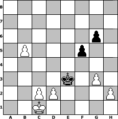 Partie-Notation im PGN-Format [Event "Herbst 2014"] [Site "www.mySchach.de"] [Date "2014.09.08"] [Round "1"] [White "Knight"] [Black "Caligula"] [ECO "D00"] [WhitemyELO "1322"] [BlackmyELO "1355"] [Result "1-0"] [TimeControl "10/2592000"] [WhiteDays "120"] [BlackDays "107"] [MySchachNr "95809"] 1. d4 d5 2. e4 dxe4 3. Nc3 f5 4. f3 Nf6 5. Be3 exf3 6. Qxf3 e6 7. O-O-O Nc6 8. Bb5 Bd7 9. d5 Ne5 10. Qh5+ g6 11. Bxd7+ Qxd7 12. Qh4 Be7 13. dxe6 Qxe6 14. Qa4+ c6 15. Nge2 b5 16. Nxb5 cxb5 17. Qxb5+ Kf7 18. Nf4 Qxa2 19. Qd5+ Qxd5 20. Nxd5 Nxd5 21. Rxd5 Nc4 22. Bd4 Ke6 23. Rb5 Rhd8 24. Re1+ Kd7 25. Rb7+ Kc6 26. Rexe7 Rxd4 27. Rxh7 Rad8 28. Rhc7+ Kd6 29. Rxa7 Ke5 30. Re7+ Kf4 31. g3+ Kg4 32. Re1 Ne3 33. b4 Kf3 34. Ra3 Rd1+ 35. Rxd1 Re8 36. Re1 Kf2 37. Rexe3 Rxe3 38. Rxe3 Kxe3 39. b5 1-0 Stellungs-Notation im FEN-Format 8/8/6p1/1P3p2/8/4k1P1/2PP3P/2K5 - - - 0 39 Geschlagene Figuren Weiss: Geschlagene Figuren Schwarz: Klicken Sie auf eine geschlagene Figur um den gewünschten Zug darzustellen!