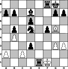 Partie-Notation im PGN-Format [Event "1.Manschaftstunier der MIB-Jetzt Wirts Brutal"] [Site "www.mySchach.de"] [Date "2006.05.19"] [Round "1"] [White "Oma"] [Black "Mike"] [ECO "C25"] [WhitemyELO "1001"] [BlackmyELO "1358"] [Result "0-1"] [TimeControl "10/2592000"] [WhiteDays "74"] [BlackDays "81"] [MySchachNr "25498"] 1. e4 e5 2. Nc3 Bc5 3. Nh3 d6 4. g4 Qh4 5. Qf3 Bxg4 6. Qg3 Qxg3 7. fxg3 Nf6 8. Bb5+ c6 9. Nf2 Bxf2+ 10. Kxf2 cxb5 11. h3 Bd7 12. Re1 Na6 13. Nd5 Nxd5 14. exd5 O-O 15. d3 f5 16. Bd2 Nc7 17. b3 Rae8 18. b4 Nxd5 19. Re2 e4 20. Rae1 exd3 21. Bg5 Rxe2+ 22. Kf1 Rxe1+ 0-1 Stellungs-Notation im FEN-Format 5rk1/pp1b2pp/3p4/1p1n1pB1/1P6/3p2PP/P1P5/4rK2 - - - 0 23 Geschlagene Figuren Weiss: Geschlagene Figuren Schwarz: Klicken Sie auf eine geschlagene Figur um den gewünschten Zug darzustellen!