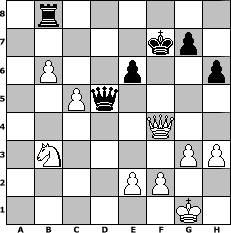 Partie-Notation im PGN-Format [Event "Der Mai ist gekommen!"] [Site "www.mySchach.de"] [Date "2009.05.05"] [Round "1"] [White "Naunhofer"] [Black "RashimIbenRohal"] [ECO "B10"] [WhitemyELO "1608"] [BlackmyELO "1581"] [Result "1-0"] [TimeControl "10/864000"] [WhiteDays "40"] [BlackDays "28"] [MySchachNr "55431"] 1. e4 c6 2. Nf3 d5 3. exd5 cxd5 4. d4 Nc6 5. Bb5 Bd7 6. O-O e6 7. Be3 Nf6 8. Nbd2 Bd6 9. c4 a6 10. Bxc6 Bxc6 11. c5 Bc7 12. a4 h6 13. b4 O-O 14. Qb3 Ng4 15. h3 Nxe3 16. Qxe3 Qf6 17. Rfe1 Bf4 18. Qd3 Rfe8 19. b5 axb5 20. axb5 Bd7 21. Nb3 Rxa1 22. Rxa1 e5 23. dxe5 Bxe5 24. Ra7 Bb8 25. Rxb7 Bf5 26. Qxd5 Rd8 27. Rxb8 Rxb8 28. Nfd4 Be6 29. Nxe6 fxe6 30. Qc4 Qe5 31. g3 Kf7 32. b6 Qd5 33. Qf4+ 1-0 Stellungs-Notation im FEN-Format 1r6/5kp1/1P2p2p/2Pq4/5Q2/1N4PP/4PP2/6K1 - - - 2 33 Geschlagene Figuren Weiss: Geschlagene Figuren Schwarz: Klicken Sie auf eine geschlagene Figur um den gewünschten Zug darzustellen!