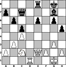 Partie-Notation im PGN-Format [Event "Anti-Computer-Turnier"] [Site "www.mySchach.de"] [Date "2005.04.26"] [Round "1"] [White "Caligula"] [Black "Tarot"] [ECO "A10"] [WhitemyELO "1383"] [BlackmyELO "1816"] [Result "1/2-1/2"] [TimeControl "10/2592000"] [WhiteDays "90"] [BlackDays "84"] [MySchachNr "12490"] 1. c4 f5 2. d4 Nf6 3. Nf3 d6 4. Nc3 Nbd7 5. Bg5 e6 6. e4 fxe4 7. Nxe4 Be7 8. Bxf6 Nxf6 9. Nxf6+ Bxf6 10. Bd3 O-O 11. O-O c6 12. Qc2 g6 13. Rfe1 c5 14. dxc5 dxc5 15. Be4 Rb8 16. Rad1 Qc7 17. b3 b6 18. Qd2 Rd8 19. Qc2 Rxd1 20. Rxd1 Bb7 21. Bxb7 Qxb7 22. Qe2 Re8 23. Ne5 Qc7 24. Ng4 Bg7 25. g3 h5 26. Ne3 Bd4 27. Nc2 Bg7 1/2-1/2 Stellungs-Notation im FEN-Format 4r1k1/p1q3b1/1p2p1p1/2p4p/2P5/1P4P1/P1N1QP1P/3R2K1 - - - 4 28 Geschlagene Figuren Weiss: ![]() ![]() ![]() ![]() ![]() ![]() ![]() ![]() ![]() ![]() ![]() ![]() ![]() ![]() ![]() Geschlagene Figuren Schwarz: ![]() ![]() ![]() ![]() ![]() ![]() ![]() ![]() ![]() ![]() ![]() ![]() ![]() ![]() ![]() Klicken Sie auf eine geschlagene Figur um den gewünschten Zug darzustellen!