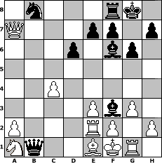 Partie-Notation im PGN-Format [Event "960-2021-59- Geburtstagsturnier"] [Site "www.mySchach.de"] [Date "2021.02.18"] [Round "1"] [White "alibengali"] [Black "larlinde"] [Variant "Fischerrandom"] [SetUp "1"] [FEN "nnrqbkrb/pppppppp/8/8/8/8/PPPPPPPP/NNRQBKRB w KQkq - 0 1"] [WhitemyELO "1644"] [BlackmyELO "2115"] [Result "0-1"] [TimeControl "10/2592000"] [WhiteDays "27"] [BlackDays "29"] [MySchachNr "121238"] 1. Nb3 c5 2. c4 g6 3. d4 cxd4 4. Nxd4 Qb6 5. e3 Qxb2 6. Rc2 Qb6 7. g3 d6 8. Qf3 Bxd4 9. Qxb7 Bf6 10. Qxc8 Qxb1 11. Bxa8 O-O 12. Re2 Bc6 13. Qc7 Bxa8 14. Qxa7 Bf3 0-1 Stellungs-Notation im FEN-Format 1n3rk1/Q3pp1p/3p1bp1/8/2P5/4PbP1/P3RP1P/Nq2BKR1 - K - 1 15 Geschlagene Figuren Weiss: Geschlagene Figuren Schwarz: Klicken Sie auf eine geschlagene Figur um den gewünschten Zug darzustellen!