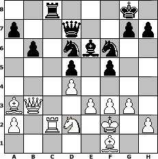 Partie-Notation im PGN-Format [Event "Katalanisch"] [Site "www.mySchach.de"] [Date "2012.06.11"] [Round "1"] [White "lasker"] [Black "Tigerle"] [ECO "E00"] [WhitemyELO "1417"] [BlackmyELO "1519"] [Result "0-1"] [TimeControl "10/1728000"] [WhiteDays "00"] [BlackDays "17"] [MySchachNr "82144"] 1. d4 Nf6 2. c4 e6 3. g3 Bb4+ 4. Nc3 O-O 5. Nf3 d5 6. Bg2 Ne4 7. Qc2 c6 8. O-O Bxc3 9. bxc3 Nd7 10. cxd5 exd5 11. c4 f5 12. cxd5 cxd5 13. Ba3 Re8 14. Rfe1 Ndf6 15. Nd2 Qb6 16. e3 Bd7 17. f3 Nd6 18. Rab1 Qa6 19. Qb3 Be6 20. Bf1 Qc6 21. Kf2 b6 22. Rbc1 Qd7 23. Rc2 Rec8 24. Rec1 Rxc2 25. Rxc2 Rc8 0-1 Stellungs-Notation im FEN-Format 2r3k1/p2q2pp/1p1nbn2/3p1p2/3P4/BQ2PPP1/P1RN1K1P/5B2 - - - 1 26 Geschlagene Figuren Weiss: Geschlagene Figuren Schwarz: Klicken Sie auf eine geschlagene Figur um den gewünschten Zug darzustellen!