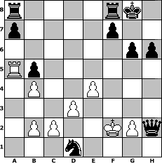 Partie-Notation im PGN-Format [Event "O, Du fröhlische"] [Site "www.mySchach.de"] [Date "2018.11.26"] [Round "2"] [White "Haneken"] [Black "hape50"] [ECO "C41"] [WhitemyELO "1079"] [BlackmyELO "1287"] [Result "0-1"] [TimeControl "10/2592000"] [WhiteDays "87"] [BlackDays "86"] [MySchachNr "113550"] 1. e4 e5 2. Nf3 d6 3. Be2 h6 4. Nc3 Be6 5. Bb5+ c6 6. Ba4 Nf6 7. d3 b5 8. Bb3 d5 9. O-O d4 10. Ne2 Nh5 11. Nxe5 Bxb3 12. axb3 Bd6 13. f4 O-O 14. Nxd4 Bxe5 15. fxe5 Qxd4+ 16. Kh1 Qxe5 17. Rf5 Ng3+ 18. hxg3 Qxg3 19. Bf4 Qh4+ 20. Kg1 g6 21. Rc5 Qxf4 22. Rxc6 Nxc6 23. Ra6 Ne5 24. b4 Ng4 25. Ra5 Qh2+ 26. Kf1 Ne3+ 27. Kf2 Nxd1+ 0-1 Stellungs-Notation im FEN-Format r4rk1/p4p2/6pp/Rp6/1P2P3/3P4/1PP2KPq/3n4 - - - 0 28 Geschlagene Figuren Weiss: Geschlagene Figuren Schwarz: Klicken Sie auf eine geschlagene Figur um den gewünschten Zug darzustellen!