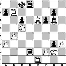 Partie-Notation im PGN-Format [Event "Premierenturnier"] [Site "www.mySchach.de"] [Date "2004.03.31"] [Round "1"] [White "MaxPayne"] [Black "NoBody"] [ECO "B01"] [WhitemyELO "1500"] [BlackmyELO "1726"] [Result "1-0"] [TimeControl "10/864000"] [WhiteDays "32"] [BlackDays "40"] [MySchachNr "3565"] 1. e4 d5 2. exd5 Qxd5 3. Nc3 Qa5 4. d4 Nf6 5. Nf3 c6 6. Be2 Bf5 7. Bd2 Qc7 8. O-O Nbd7 9. Bc4 e6 10. Re1 O-O-O 11. a3 Bd6 12. g3 Bg4 13. Kg2 Nb6 14. Ba2 Rhe8 15. h3 Bh5 16. Ne4 Nxe4 17. Rxe4 Kb8 18. c4 Be7 19. Bf4 Bd6 20. Bxd6 Qxd6 21. c5 Qc7 22. cxb6 Qxb6 23. Qb3 Qc7 24. Ne5 Rd5 25. Qc3 Rd6 26. Rc1 Red8 27. b4 f6 28. Nd3 Bg6 29. Rxe6 Rxd4 30. Nc5 Rd2 31. Bb3 h5 32. Rce1 h4 33. Re7 Qxg3+ 34. Qxg3+ hxg3 35. Rxb7+ Kc8 36. Be6+ 1-0 Stellungs-Notation im FEN-Format 2kr4/pR4p1/2p1Bpb1/2N5/1P6/P5pP/3r1PK1/4R3 - - - 2 36 Geschlagene Figuren Weiss: Geschlagene Figuren Schwarz: Klicken Sie auf eine geschlagene Figur um den gewünschten Zug darzustellen!