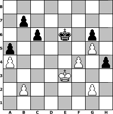 | Partie-Notation im PGN-Format [Event "Hochexplosiv"] [Site "www.mySchach.de"] [Date "2009.05.01"] [Round "1"] [White "muetoe"] [Black "herieg26928 (adv.)"] [ECO "D08"] [WhitemyELO "1946"] [BlackmyELO "1799"] [Result "0-1"] [TimeControl "10/2592000"] [WhiteDays "29"] [BlackDays "29"] [MySchachNr "55326"] 1. d4 d5 2. c4 e5 3. Nc3 dxc4 4. e3 exd4 5. exd4 Nf6 6. Bxc4 Bd6 7. Nf3 O-O 8. O-O Nc6 9. Bg5 Bg4 10. Re1 Bxf3 11. Qxf3 Nxd4 12. Qd3 Ne6 13. Bh4 Nf4 14. Qf3 Ng6 15. Bg3 Bxg3 16. hxg3 c6 17. Rad1 Qc7 18. Ne4 Nxe4 19. Qxe4 Rad8 20. Rxd8 Rxd8 21. a4 a6 22. Re3 Rd7 23. Qe8+ Nf8 24. Re1 g6 25. Bb3 Kg7 26. Qe3 Qd6 27. Re2 h5 28. Qc3+ Qd4 29. Qxd4+ Rxd4 30. Re7 Rd7 31. Re3 Nh7 32. Kf1 Rd2 33. Re2 Rxe2 34. Kxe2 a5 35. Ke3 Nf8 36. Kd4 Nd7 37. f4 Kf6 38. Bd1 Ke7 39. g4 h4 40. g5 Ke6 41. Bb3+ Kf5 42. Ke3 Nc5 43. Bxf7 Ne6 44. Bxe6+ Kxe6 0-1 Stellungs-Notation im FEN-Format 8/1p6/2p1k1p1/p5P1/P4P1p/4K3/1P4P1/8 - - - 0 45 Geschlagene Figuren Weiss:                              Geschlagene Figuren Schwarz:                               Klicken Sie auf eine geschlagene Figur um den gewünschten Zug darzustellen!