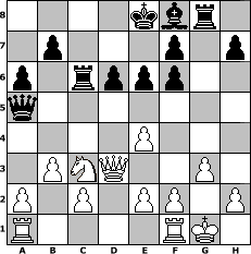 Partie-Notation im PGN-Format [Event "Ranglistenturnier DWZ 1800 bis 2380 Gr.A"] [Site "www.mySchach.de"] [Date "2015.03.09"] [Round "1"] [White "bjeu"] [Black "HenrySchinasky"] [ECO "B20"] [WhitemyELO "2129"] [BlackmyELO "2116"] [Result "1/2-1/2"] [TimeControl "10/2592000"] [WhiteDays "12"] [BlackDays "18"] [MySchachNr "98478"] 1. e4 c5 2. b3 Nc6 3. Bb2 d6 4. Bb5 Bd7 5. Nf3 Nf6 6. Bxf6 gxf6 7. Nc3 a6 8. Bxc6 Bxc6 9. O-O Rg8 10. g3 e6 11. d4 Qa5 12. Qd3 cxd4 13. Nxd4 Rc8 14. Nxc6 Rxc6 1/2-1/2 Stellungs-Notation im FEN-Format 4kbr1/1p3p1p/p1rppp2/q7/4P3/1PNQ2P1/P1P1PP1P/R4RK1 - - - 0 15 Geschlagene Figuren Weiss: ![]() ![]() ![]() ![]() ![]() ![]() ![]() ![]() ![]() ![]() ![]() ![]() ![]() ![]() ![]() Geschlagene Figuren Schwarz: ![]() ![]() ![]() ![]() ![]() ![]() ![]() ![]() ![]() ![]() ![]() ![]() ![]() ![]() ![]() Klicken Sie auf eine geschlagene Figur um den gewünschten Zug darzustellen!