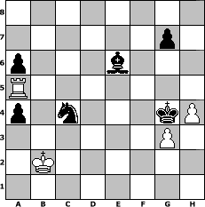 Partie-Notation im PGN-Format [Event "Amethyst"] [Site "www.mySchach.de"] [Date "2022.01.23"] [Round "1"] [White "lotchi"] [Black "skuehnel"] [ECO "D00"] [WhitemyELO "1246"] [BlackmyELO "1270"] [Result "0-1"] [TimeControl "10/2592000"] [WhiteDays "141"] [BlackDays "146"] [MySchachNr "124338"] 1. d4 d5 2. e4 dxe4 3. c4 c5 4. d5 Nf6 5. Nc3 e6 6. Bg5 Be7 7. Bxf6 Bxf6 8. Nxe4 Bxb2 9. Rb1 Qb6 10. Qb3 exd5 11. cxd5 Qa5+ 12. Ke2 Bd4 13. Qb5+ Qxb5+ 14. Rxb5 O-O 15. f3 Re8 16. Nh3 f5 17. Kd2 fxe4 18. fxe4 Rxe4 19. Bc4 a6 20. Rb3 b5 21. Bd3 Be3+ 22. Kc2 Rd4 23. Bxh7+ Kxh7 24. Rxe3 Rxd5 25. Nf4 Bf5+ 26. Kb2 Rd7 27. g3 Nc6 28. Ne6 Re8 29. Ng5+ Kg6 30. Rxe8 Kxg5 31. Re2 Nd4 32. Re5 c4 33. h3 Nf3 34. h4+ Kg4 35. Rc5 Rd3 36. a4 Rb3+ 37. Ka2 Be6 38. Rb1 bxa4 39. Ka1 Nd2 40. Rxb3 cxb3 41. Ra5 b2+ 42. Kxb2 Nc4+ 0-1 Stellungs-Notation im FEN-Format 8/6p1/p3b3/R7/p1n3kP/6P1/1K6/8 - - - 1 43 Geschlagene Figuren Weiss: Geschlagene Figuren Schwarz: Klicken Sie auf eine geschlagene Figur um den gewünschten Zug darzustellen!