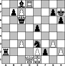 Partie-Notation im PGN-Format [Event "1. Weltmeisterschaft @ myschach.de"] [Site "www.mySchach.de"] [Date "2006.09.15"] [Round "1"] [White "Master1"] [Black "ujack1961"] [ECO "C47"] [WhitemyELO "2017"] [BlackmyELO "1774"] [Result "0-1"] [TimeControl "10/2592000"] [WhiteDays "120"] [BlackDays "120"] [MySchachNr "28480"] 1. e4 e5 2. Nf3 Nc6 3. Nc3 Nf6 4. Bc4 Bc5 5. d3 O-O 6. O-O h6 7. Re1 d6 8. a3 Ng4 9. Rf1 a6 10. b4 Ba7 11. b5 axb5 12. Nxb5 Bc5 13. Bb2 Na5 14. d4 Nxc4 15. dxc5 Nxb2 16. Qc1 Nc4 17. Rd1 f5 18. cxd6 fxe4 19. dxc7 Qf6 20. Rd8 exf3 21. Rxf8+ Qxf8 22. g3 Qc5 23. Qe1 Qxb5 24. Rd1 Qc6 25. Rd8+ Kh7 26. Qd1 Rxa3 27. c3 Nxf2 28. Kxf2 Ra2+ 29. Kf1 Ne3+ 30. Ke1 f2# 0-1 Stellungs-Notation im FEN-Format 2bR4/1pP3pk/2q4p/4p3/8/2P1n1P1/r3Pp1P/3QK3 - - - 0 31 Geschlagene Figuren Weiss: ![]() ![]() ![]() ![]() ![]() ![]() ![]() ![]() ![]() ![]() ![]() ![]() ![]() ![]() ![]() Geschlagene Figuren Schwarz: ![]() ![]() ![]() ![]() ![]() ![]() ![]() ![]() ![]() ![]() ![]() ![]() ![]() ![]() ![]() Klicken Sie auf eine geschlagene Figur um den gewünschten Zug darzustellen!