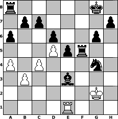 Partie-Notation im PGN-Format [Event "uns Nr. 6"] [Site "www.mySchach.de"] [Date "2012.10.27"] [Round "1"] [White "MiFie"] [Black "augustus"] [ECO "C46"] [WhitemyELO "1093"] [BlackmyELO "1330"] [Result "0-1"] [TimeControl "10/864000"] [WhiteDays "05"] [BlackDays "10"] [MySchachNr "84712"] 1. e4 e5 2. Nf3 Nc6 3. Nc3 d6 4. d4 Bg4 5. h3 Bxf3 6. gxf3 Be7 7. d5 Nd4 8. Rg1 g6 9. Bd3 a6 10. Bg5 Bxg5 11. b3 Qf6 12. Ne2 Nxf3+ 13. Kf1 Nxg1 14. Kxg1 Bh4 15. Ng3 Qg5 16. Qg4 Nf6 17. f4 Qxg4 18. hxg4 Bxg3 19. Rf1 Bxf4 20. a4 Nxg4 21. Be2 Be3+ 22. Kg2 Nf2 23. c4 O-O 24. Re1 f5 25. exf5 Rxf5 26. Bg4 Nxg4 0-1 Stellungs-Notation im FEN-Format r5k1/1pp4p/p2p2p1/3Ppr2/P1P3n1/1P2b3/6K1/4R3 - - - 0 27 Geschlagene Figuren Weiss: Geschlagene Figuren Schwarz: Klicken Sie auf eine geschlagene Figur um den gewünschten Zug darzustellen!