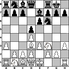 Partie-Notation im PGN-Format [Event "Turnier in den M"] [Site "www.mySchach.de"] [Date "2014.02.19"] [Round "1"] [White "hape50"] [Black "Ziegert"] [ECO "D00"] [WhitemyELO "1284"] [BlackmyELO "1485"] [Result "1-0"] [TimeControl "10/2592000"] [WhiteDays "29"] [BlackDays "00"] [MySchachNr "93102"] 1. d4 d5 2. h3 Nf6 3. Nf3 e6 4. a3 Be7 5. e3 O-O 6. Bd3 1-0 Stellungs-Notation im FEN-Format rnbq1rk1/ppp1bppp/4pn2/3p4/3P4/P2BPN1P/1PPP1PP1/RNBQK2R - KQ - 2 6 Geschlagene Figuren Weiss: Geschlagene Figuren Schwarz: Klicken Sie auf eine geschlagene Figur um den gewünschten Zug darzustellen!