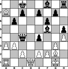 Partie-Notation im PGN-Format [Event "F"] [Site "www.mySchach.de"] [Date "2006.05.06"] [Round "2"] [White "FreshPrinc2"] [Black "Chaos"] [ECO "A00"] [WhitemyELO "1670"] [BlackmyELO "1766"] [Result "1/2-1/2"] [TimeControl "10/1728000"] [WhiteDays "20"] [BlackDays "20"] [MySchachNr "25223"] 1. g3 h5 2. Nf3 d5 3. Bg2 Bf5 4. d4 Nc6 5. Nc3 Qd7 6. h4 Nf6 7. Bg5 O-O-O 8. a3 Ne4 9. Nxe4 dxe4 10. Ne5 Nxe5 11. dxe5 Qb5 12. Qc1 Qxe5 13. O-O Qe6 14. Rd1 Rxd1+ 15. Qxd1 f6 16. Be3 Qc4 17. Bxa7 b6 18. b3 1/2-1/2 Stellungs-Notation im FEN-Format 2k2b1r/B1p1p1p1/1p3p2/5b1p/2q1p2P/PP4P1/2P1PPB1/R2Q2K1 - - - 0 18 Geschlagene Figuren Weiss: Geschlagene Figuren Schwarz: Klicken Sie auf eine geschlagene Figur um den gewünschten Zug darzustellen!