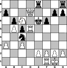 Partie-Notation im PGN-Format [Event "unter uns Nr 4"] [Site "www.mySchach.de"] [Date "2012.09.14"] [Round "1"] [White "augustus"] [Black "borsti"] [ECO "C50"] [WhitemyELO "1271"] [BlackmyELO "1242"] [Result "1-0"] [TimeControl "10/864000"] [WhiteDays "10"] [BlackDays "10"] [MySchachNr "83897"] 1. e4 e5 2. Nf3 Nc6 3. Bc4 Bc5 4. O-O Nf6 5. d3 d6 6. Be3 Bg4 7. Bxc5 dxc5 8. c3 Qd6 9. Nbd2 O-O-O 10. a3 Na5 11. b4 Nc6 12. b5 Na5 13. Rb1 b6 14. Qc2 Bxf3 15. Nxf3 Nxc4 16. dxc4 Qd3 17. Qa4 Kb8 18. Nxe5 Rde8 19. Nc6+ Kc8 20. Rbd1 Nxe4 21. Qa6+ Kd7 22. Rxd3+ Nd6 23. Rd5 f6 24. Qb7 Ke6 25. Qxc7 Nxc4 26. Qd7# 1-0 Stellungs-Notation im FEN-Format 4r2r/p2Q2pp/1pN1kp2/1PpR4/2n5/P1P5/4PPPP/5RK1 - - - 1 26 Geschlagene Figuren Weiss: Geschlagene Figuren Schwarz: Klicken Sie auf eine geschlagene Figur um den gewünschten Zug darzustellen!