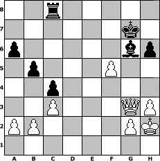 Partie-Notation im PGN-Format [Event "1. TM-Turnier"] [Site "www.mySchach.de"] [Date "2013.02.26"] [Round "1"] [White "Joschi"] [Black "Steffi"] [ECO "C87"] [WhitemyELO "1593"] [BlackmyELO "1562"] [Result "1-0"] [TimeControl "10/2592000"] [WhiteDays "30"] [BlackDays "29"] [MySchachNr "86826"] 1. e4 e5 2. Nf3 Nc6 3. Bb5 a6 4. Ba4 Nf6 5. O-O Be7 6. Re1 d6 7. h3 O-O 8. c3 b5 9. Bc2 Bb7 10. d4 Rc8 11. Nbd2 Nb8 12. dxe5 dxe5 13. Nxe5 c5 14. Qe2 Re8 15. Nef3 c4 16. Nf1 Bc5 17. Ng3 Nc6 18. Bg5 h6 19. Be3 Bxe3 20. Qxe3 Qc7 21. Rad1 Ne5 22. Nxe5 Qxe5 23. f4 Qe7 24. e5 g6 25. Qf2 Nd5 26. Ne4 Kg7 27. Qg3 Qe6 28. Nd6 Ba8 29. Nxc8 Rxc8 30. Kh2 Ne7 31. Rd6 Nf5 32. Bxf5 Qxf5 33. e6 fxe6 34. Rexe6 Be4 35. Rxg6+ Qxg6 36. Rxg6+ Bxg6 37. f5 1-0 Stellungs-Notation im FEN-Format 2r5/6k1/p5bp/1p3P2/2p5/2P3QP/PP4PK/8 - - - 0 37 Geschlagene Figuren Weiss: Geschlagene Figuren Schwarz: Klicken Sie auf eine geschlagene Figur um den gewünschten Zug darzustellen!