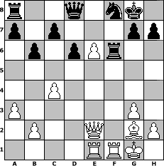 Partie-Notation im PGN-Format [Event "Nimzo-Indisch II"] [Site "www.mySchach.de"] [Date "2012.08.30"] [Round "2"] [White "deepsabel"] [Black "Sanji"] [ECO "?"] [WhitemyELO "2007"] [BlackmyELO "1527"] [Result "1-0"] [TimeControl "10/1728000"] [WhiteDays "20"] [BlackDays "16"] [MySchachNr "83558"] 1. d4 Nf6 2. c4 e6 3. Nc3 Bb4 4. e3 b6 5. Nge2 Ne4 6. Bd2 Nxd2 7. Qxd2 O-O 8. a3 Be7 9. Nf4 Bb7 10. d5 e5 11. Nd3 d6 12. g3 Nd7 13. Bg2 f5 14. O-O Rf6 15. e4 fxe4 16. Nxe4 Rh6 17. f4 exf4 18. Nxf4 Nf8 19. Rae1 Bc8 20. Qe2 Bf6 21. Nxf6+ Rxf6 22. Ne6 Bxe6 23. dxe6 1-0 Stellungs-Notation im FEN-Format r2q1nk1/p1p3pp/1p1pPr2/8/2P5/P5P1/1P2Q1BP/4RRK1 - - - 0 23 Geschlagene Figuren Weiss: Geschlagene Figuren Schwarz: Klicken Sie auf eine geschlagene Figur um den gewünschten Zug darzustellen!