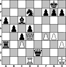 Partie-Notation im PGN-Format [Event "Zug um Zug gegen Fr"] [Site "www.mySchach.de"] [Date "2011.04.02"] [Round "1"] [White "hape50"] [Black "Winston"] [ECO "D00"] [WhitemyELO "1331"] [BlackmyELO "1445"] [Result "0-1"] [TimeControl "10/2592000"] [WhiteDays "119"] [BlackDays "120"] [MySchachNr "73150"] 1. d4 d5 2. h3 e6 3. a3 c5 4. e3 a6 5. Nf3 c4 6. Nc3 Bd6 7. Be2 b5 8. Bd2 Ne7 9. O-O O-O 10. Nh2 e5 11. dxe5 Bxe5 12. f4 Bc7 13. b3 Bb7 14. Bf3 Bb6 15. Kh1 Nf5 16. Ne2 Bxe3 17. Ng4 Bb6 18. b4 Re8 19. Nc3 Ng3+ 20. Kh2 Nxf1+ 21. Qxf1 Bd4 22. Rd1 Qd6 23. Kh1 Nd7 24. Ne2 Bb6 25. Bc3 Be3 26. Nxe3 Rxe3 27. g3 Rae8 28. Nd4 Rxc3 29. Nf5 Qg6 30. g4 Qb6 31. Nd4 Rxa3 32. Qf2 Qd6 33. Ne2 Qxb4 34. c3 Qb2 35. Qa7 Bc6 36. Qd4 Rxe2 37. Bxe2 Qxe2 0-1 Stellungs-Notation im FEN-Format 6k1/3n1ppp/p1b5/1p1p4/2pQ1PP1/r1P4P/4q3/3R3K - - - 0 38 Geschlagene Figuren Weiss: Geschlagene Figuren Schwarz: Klicken Sie auf eine geschlagene Figur um den gewünschten Zug darzustellen!