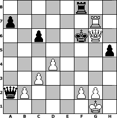 Partie-Notation im PGN-Format [Event "Trainingslager"] [Site "www.mySchach.de"] [Date "2011.05.21"] [Round "1"] [White "Knight"] [Black "Hobbykegler"] [ECO "A40"] [WhitemyELO "1145"] [BlackmyELO "1073"] [Result "1-0"] [TimeControl "10/2592000"] [WhiteDays "120"] [BlackDays "083"] [MySchachNr "74026"] 1. d4 e6 2. e4 Nf6 3. Nc3 g6 4. Nf3 Bg7 5. Bg5 h6 6. Bxf6 Qxf6 7. Be2 O-O 8. e5 Qf5 9. O-O f6 10. Nb5 Na6 11. Bc4 Kh7 12. exf6 Bxf6 13. Re1 c6 14. Nd6 Qa5 15. Nxc8 Raxc8 16. Ne5 Rg8 17. Nxd7 Be7 18. Rxe6 Bg5 19. Bd3 Nb4 20. Bxg6+ Rxg6 21. Re7+ Bxe7 22. c3 Nd5 23. Ne5 Rg7 24. Qh5 Rf8 25. Re1 Rg5 26. Qe2 Nf4 27. Qc2+ Ng6 28. Nxg6 Rxg6 29. h4 h5 30. Rxe7+ Kh6 31. Qd2+ Rg5 32. hxg5+ Kg6 33. Rxb7 Qxa2 34. Qd3+ Kxg5 35. Rg7+ Kf6 36. Qg6# 1-0 Stellungs-Notation im FEN-Format 5r2/p5R1/2p2kQ1/7p/3P4/2P5/qP3PP1/6K1 - - - 3 36 Geschlagene Figuren Weiss: Geschlagene Figuren Schwarz: Klicken Sie auf eine geschlagene Figur um den gewünschten Zug darzustellen!