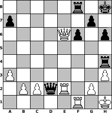 Partie-Notation im PGN-Format [Event "Schach dem Osterhasen IV"] [Site "www.mySchach.de"] [Date "2015.03.29"] [Round "1"] [White "Andylein1989"] [Black "Ziegert"] [ECO "C42"] [WhitemyELO "1499"] [BlackmyELO "1364"] [Result "1-0"] [TimeControl "10/2592000"] [WhiteDays "93"] [BlackDays "00"] [MySchachNr "98742"] 1. e4 e5 2. Nf3 Nf6 3. Nc3 Bb4 4. d3 O-O 5. Bd2 Re8 6. a3 Bc5 7. Be2 c6 8. O-O d5 9. exd5 cxd5 10. Qc1 Nc6 11. h3 Bf5 12. Bg5 e4 13. dxe4 dxe4 14. Nd2 Qd6 15. Re1 e3 16. Bxe3 Bxe3 17. fxe3 Qg3 18. Kh1 Ne4 19. Ndxe4 Bxe4 20. Nxe4 Rxe4 21. Bf3 Rh4 22. Bxc6 bxc6 23. Qd2 h6 24. Rf1 Qg5 25. Qd7 f6 26. Qxc6 Rf8 27. Rad1 Qxe3 28. Rde1 Qd2 29. Qe6+ Kh8 30. Re2 1-0 Stellungs-Notation im FEN-Format 5r1k/p5p1/4Qp1p/8/7r/P6P/1PPqR1P1/5R1K - - - 5 30 Geschlagene Figuren Weiss: Geschlagene Figuren Schwarz: Klicken Sie auf eine geschlagene Figur um den gewünschten Zug darzustellen!