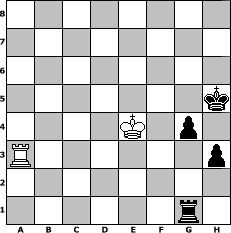 Partie-Notation im PGN-Format [Event "°°°Das_Jahr_2010 TEIL1°°°"] [Site "www.mySchach.de"] [Date "2010.01.09"] [Round "1"] [White "werderfan"] [Black "Andylein1989"] [ECO "D53"] [WhitemyELO "1527"] [BlackmyELO "1481"] [Result "0-1"] [TimeControl "10/1728000"] [WhiteDays "118"] [BlackDays "091"] [MySchachNr "62220"] 1. d4 d5 2. c4 e6 3. Nc3 Nf6 4. Bg5 Be7 5. Nf3 h6 6. Bh4 dxc4 7. e3 O-O 8. Bxc4 c6 9. O-O Nd5 10. Bxe7 Qxe7 11. Nxd5 cxd5 12. Bd3 Bd7 13. Qc2 Nc6 14. a3 a6 15. Rac1 Qf6 16. e4 dxe4 17. Bxe4 Nxd4 18. Nxd4 Qxd4 19. Rcd1 Qa4 20. Qxa4 Bxa4 21. Bxb7 Ra7 22. Rd4 Bb5 23. Bxa6 Rxa6 24. Rd1 Be2 25. R1d2 Bh5 26. f3 Rb8 27. h4 Rab6 28. Rd8+ Kh7 29. Rxb8 Rxb8 30. g4 Bg6 31. h5 Bb1 32. b4 Rc8 33. Rb2 Bd3 34. b5 Rb8 35. b6 Bc4 36. a4 Ba6 37. Kf2 Bb7 38. Ke3 Rc8 39. a5 Rc3+ 40. Kd4 Rxf3 41. a6 Bxa6 42. b7 Bxb7 43. Rxb7 Rf4+ 44. Ke5 Rxg4 45. Rxf7 Rg5+ 46. Kxe6 Rxh5 47. Rf2 Rg5 48. Rh2 h5 49. Rh4 Kh6 50. Rh3 Rg4 51. Kf5 g6+ 52. Kf6 g5 53. Kf5 Rg1 54. Rf3 h4 55. Rh3 Kh5 56. Ke4 g4 57. Ra3 h3 0-1 Stellungs-Notation im FEN-Format 8/8/8/7k/4K1p1/R6p/8/6r1 - - - 0 58 Geschlagene Figuren Weiss: ![]() ![]() ![]() ![]() ![]() ![]() ![]() ![]() ![]() ![]() ![]() ![]() ![]() ![]() ![]() Geschlagene Figuren Schwarz: ![]() ![]() ![]() ![]() ![]() ![]() ![]() ![]() ![]() ![]() ![]() ![]() ![]() ![]() ![]() Klicken Sie auf eine geschlagene Figur um den gewünschten Zug darzustellen!