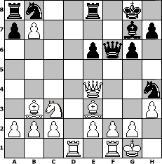 Partie-Notation im PGN-Format [Event "1. Intergalaktische Meisterschaften"] [Site "www.mySchach.de"] [Date "2006.03.07"] [Round "1"] [White "bjeu"] [Black "Jens1943"] [ECO "B01"] [WhitemyELO "2065"] [BlackmyELO "1384"] [Result "1-0"] [TimeControl "10/1728000"] [WhiteDays "19"] [BlackDays "19"] [MySchachNr "23283"] 1. e4 d5 2. exd5 Nf6 3. Bb5+ Bd7 4. Bc4 c6 5. Nc3 g6 6. Nf3 Bg7 7. O-O O-O 8. d4 Bg4 9. h3 Bxf3 10. Qxf3 Ne8 11. Be3 Nd6 12. Bb3 Nf5 13. Rad1 Nh4 14. Qe4 e6 15. dxe6 fxe6 16. d5 Re8 17. dxc6 Qf6 18. cxb7 1-0 Stellungs-Notation im FEN-Format rn2r1k1/pP4bp/4pqp1/8/4Q2n/1BN1B2P/PPP1PPP1/3R1RK1 - - - 0 18 Geschlagene Figuren Weiss: Geschlagene Figuren Schwarz: Klicken Sie auf eine geschlagene Figur um den gewünschten Zug darzustellen!