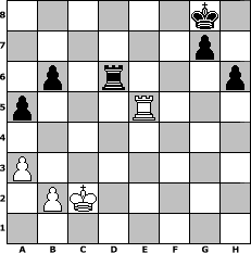 Partie-Notation im PGN-Format [Event "1-2009"] [Site "www.mySchach.de"] [Date "2009.01.01"] [Round "1"] [White "BobbyF4"] [Black "thw"] [ECO "A00"] [WhitemyELO "1584"] [BlackmyELO "1483"] [Result "1-0"] [TimeControl "10/1728000"] [WhiteDays "114"] [BlackDays "000"] [MySchachNr "51224"] 1. g4 d5 2. Bg2 Bxg4 3. c4 Nf6 4. cxd5 e5 5. Qb3 Bc5 6. d3 Bc8 7. e3 b6 8. Ne2 Bb7 9. Nbc3 O-O 10. e4 Ba6 11. Na4 Nbd7 12. Bg5 Bxf2+ 13. Kd1 h6 14. Rf1 Bd4 15. Nxd4 exd4 16. Bh4 Qe7 17. Rc1 Qe5 18. Rf5 Qxh2 19. Bxf6 Nxf6 20. Bf1 Bc8 21. Rc2 Qh4 22. Rxf6 Qxf6 23. Ke1 Qd6 24. Qc4 Bd7 25. Qxd4 Qg3+ 26. Rf2 Bxa4 27. Qxa4 Qe3+ 28. Be2 a5 29. Qc2 Rac8 30. Rf3 Qg1+ 31. Rf1 Qg6 32. d4 Rfe8 33. Bd3 Qd6 34. Qf2 Qxd5 35. Kd1 Qd7 36. e5 Re7 37. Bf5 Qd8 38. Bxc8 Qxc8 39. Qf4 Qd7 40. Qe4 f6 41. Kc2 fxe5 42. d5 Qd6 43. a3 Rd7 44. Qf5 c6 45. dxc6 Qxc6+ 46. Kb1 Qd6 47. Re1 Qd3+ 48. Qxd3 Rxd3 49. Rxe5 Rd6 50. Kc2 1-0 Stellungs-Notation im FEN-Format 6k1/6p1/1p1r3p/p3R3/8/P7/1PK5/8 - - - 2 50 Geschlagene Figuren Weiss: Geschlagene Figuren Schwarz: Klicken Sie auf eine geschlagene Figur um den gewünschten Zug darzustellen!