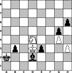 Partie-Notation im PGN-Format [Event "Dabei ist alles 7"] [Site "www.mySchach.de"] [Date "2009.06.02"] [Round "1"] [White "Andylein1989"] [Black "Naunhofer"] [ECO "B52"] [WhitemyELO "1555"] [BlackmyELO "1625"] [Result "0-1"] [TimeControl "10/864000"] [WhiteDays "03"] [BlackDays "10"] [MySchachNr "56308"] 1. e4 c5 2. Nf3 d6 3. Bb5+ Bd7 4. Bxd7+ Nxd7 5. d4 cxd4 6. Nxd4 Ngf6 7. Nc3 e6 8. O-O Be7 9. Be3 O-O 10. f4 Nc5 11. e5 dxe5 12. fxe5 Nd5 13. Nxd5 exd5 14. Nf3 b6 15. Nd4 Rc8 16. Nb5 Qd7 17. Nc3 Rfd8 18. Qf3 Qe6 19. Rad1 Rd7 20. Rxd5 Rxd5 21. Qxd5 f6 22. Bxc5 Qxd5 23. Nxd5 Bxc5+ 24. Kh1 fxe5 25. c3 Rd8 26. Rd1 Kf7 27. Ne3 Rxd1+ 28. Nxd1 Kf6 29. g4 Kg5 30. h3 a5 31. Kg2 Kf4 32. b3 e4 33. b4 axb4 34. cxb4 Bxb4 35. Nf2 g5 36. a4 Be1 37. Nd1 Bb4 38. Nb2 Ke3 39. Kf1 Bc5 40. Nc4+ Kd4 41. Nd2 Bb4 42. Nb3+ Kc3 43. Nc1 Kc2 44. Ne2 Kb3 45. Ng3 e3 46. Ke2 Bd2 47. Ne4 h6 48. Ng3 Kxa4 49. Kd3 b5 50. Ne2 b4 51. Kc2 Ka3 52. Nd4 Ka2 53. Kd3 b3 0-1 Stellungs-Notation im FEN-Format 8/8/7p/6p1/3N2P1/1p1Kp2P/k2b4/8 - - - 0 54 Geschlagene Figuren Weiss: Geschlagene Figuren Schwarz: Klicken Sie auf eine geschlagene Figur um den gewünschten Zug darzustellen!