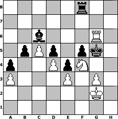 Partie-Notation im PGN-Format [Event "Herbstturnier 2"] [Site "www.mySchach.de"] [Date "2011.10.05"] [Round "1"] [White "beowulf"] [Black "Master1"] [ECO "A10"] [WhitemyELO "1395"] [BlackmyELO "1298"] [Result "1-0"] [TimeControl "10/1728000"] [WhiteDays "20"] [BlackDays "12"] [MySchachNr "76594"] 1. c4 d5 2. d4 c6 3. Nf3 Nf6 4. Bg5 e6 5. e3 Be7 6. Nc3 h6 7. Bxf6 Bxf6 8. c5 Nd7 9. b4 O-O 10. b5 cxb5 11. Bxb5 a6 12. Bxd7 Bxd7 13. O-O Bc6 14. Rb1 Rb8 15. Qc2 Re8 16. Rb2 e5 17. Rd1 e4 18. Nd2 b6 19. Nb3 b5 20. Ne2 a5 21. Rdb1 a4 22. Nd2 Re7 23. a3 Bg5 24. g3 Qd7 25. Rb4 Qh3 26. Kh1 f5 27. Ng1 Qh5 28. R1b2 Qe8 29. Nb1 h5 30. h4 Bf6 31. Nc3 Reb7 32. Nge2 g5 33. hxg5 Bxg5 34. Nf4 h4 35. Nce2 Bxf4 36. Nxf4 hxg3 37. fxg3 Rh7+ 38. Kg1 Qf8 39. Qg2 Qh6 40. Qh2 Qxh2+ 41. Rxh2 Rxh2 42. Kxh2 Re8 43. Kg2 Kg7 44. Rb1 Kh6 45. Rh1+ Kg7 46. Rh5 Rf8 47. Ne6+ Kg6 48. Nf4+ Kf6 49. Rh6+ Kg5 50. Rg6# 1-0 Stellungs-Notation im FEN-Format 5r2/8/2b3R1/1pPp1pk1/p2PpN2/P3P1P1/6K1/8 - - - 16 50 Geschlagene Figuren Weiss: Geschlagene Figuren Schwarz: Klicken Sie auf eine geschlagene Figur um den gewünschten Zug darzustellen!