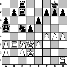 Partie-Notation im PGN-Format [Event "1.a3 Anderssens Er"] [Site "www.mySchach.de"] [Date "2005.04.08"] [Round "1"] [White "Knight"] [Black "Chelly"] [ECO "A00"] [WhitemyELO "1381"] [BlackmyELO "1777"] [Result "0-1"] [TimeControl "10/1728000"] [WhiteDays "20"] [BlackDays "18"] [MySchachNr "11934"] 1. a3 Nf6 2. d4 d5 3. Nc3 Bf5 4. Bf4 e6 5. e3 Bd6 6. Bxd6 Qxd6 7. Nb5 Qb6 8. Nf3 a6 9. Nc3 Qxb2 10. Kd2 Qb6 11. Rb1 Qa7 12. Kc1 Bg4 13. Be2 O-O 14. Ne5 Bxe2 15. Qxe2 Nbd7 16. Nxd7 Nxd7 17. Kd2 c5 18. dxc5 Rfc8 19. f4 Qxc5 20. Rb3 Qa5 21. g4 Rc7 22. h4 Rac8 23. Qd3 Nc5 0-1 Stellungs-Notation im FEN-Format 2r3k1/1pr2ppp/p3p3/q1np4/5PPP/PRNQP3/P1PK4/7R - - - 3 24 Geschlagene Figuren Weiss: Geschlagene Figuren Schwarz: Klicken Sie auf eine geschlagene Figur um den gewünschten Zug darzustellen!