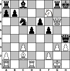 Partie-Notation im PGN-Format [Event "Der HSF feiert 3.Geburtstag-feiert dabei gern mit!"] [Site "www.mySchach.de"] [Date "2013.05.01"] [Round "1"] [White "morchel"] [Black "beowulf"] [ECO "B20"] [WhitemyELO "1429"] [BlackmyELO "1418"] [Result "1-0"] [TimeControl "10/2592000"] [WhiteDays "29"] [BlackDays "30"] [MySchachNr "88063"] 1. e4 c5 2. d4 cxd4 3. c3 dxc3 4. Nxc3 Nc6 5. Nf3 Nf6 6. Bc4 e6 7. O-O Bb4 8. Qe2 O-O 9. Rd1 Qe7 10. e5 Bxc3 11. exf6 Qxf6 12. Bg5 Qf5 13. bxc3 d5 14. Bd3 Qg4 15. h3 Qa4 16. Bc2 Qc4 17. Qe3 h6 18. Bxh6 gxh6 19. Qxh6 f5 20. Qg6+ Kh8 21. Ng5 Qh4 22. g3 Rg8 23. Nf7# 1-0 Stellungs-Notation im FEN-Format r1b3rk/pp3N2/2n1p1Q1/3p1p2/7q/2P3PP/P1B2P2/R2R2K1 - - - 2 23 Geschlagene Figuren Weiss: Geschlagene Figuren Schwarz: Klicken Sie auf eine geschlagene Figur um den gewünschten Zug darzustellen!