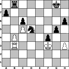 Partie-Notation im PGN-Format [Event "Sweety Tunier"] [Site "www.mySchach.de"] [Date "2006.02.28"] [Round "1"] [White "Biber"] [Black "PluckyDuck"] [ECO "C20"] [WhitemyELO "1193"] [BlackmyELO "1732"] [Result "0-1"] [TimeControl "10/2592000"] [WhiteDays "108"] [BlackDays "079"] [MySchachNr "22982"] 1. e4 e5 2. Bd3 Bc5 3. Qf3 Nf6 4. Nc3 O-O 5. g4 d5 6. b3 Nxg4 7. h3 Nxf2 8. Rh2 Nxd3+ 9. Qxd3 Bxg1 10. Rg2 Qh4+ 11. Qg3 Qxg3+ 12. Rxg3 Bb6 13. Nxd5 Be6 14. d3 Bxd5 15. exd5 Bd4 16. Rb1 f5 17. Bb2 Bxb2 18. Rxb2 Nd7 19. c4 f4 20. Rf3 Rae8 21. Re2 c6 22. dxc6 bxc6 23. a4 Nc5 24. Rb2 e4 25. dxe4 Rxe4+ 26. Re2 Rxe2+ 27. Kxe2 h6 28. b4 Nxa4 29. Ra3 Nb6 30. c5 Nd5 31. Rb3 g5 32. Kf3 Rb8 0-1 Stellungs-Notation im FEN-Format 1r4k1/p7/2p4p/2Pn2p1/1P3p2/1R3K1P/8/8 - - - 2 33 Geschlagene Figuren Weiss: Geschlagene Figuren Schwarz: Klicken Sie auf eine geschlagene Figur um den gewünschten Zug darzustellen!