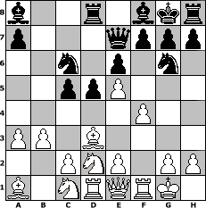 Partie-Notation im PGN-Format [Event "Die Eisenbahner sind wieder da!!"] [Site "www.mySchach.de"] [Date "2016.09.09"] [Round "1"] [White "muetoe"] [Black "nyffhans"] [Variant "Fischerrandom"] [SetUp "1"] [FEN "bnnrqbkr/pppppppp/8/8/8/8/PPPPPPPP/BNNRQBKR w KQkq - 0 1"] [WhitemyELO "1966"] [BlackmyELO "1989"] [Result "1-0"] [TimeControl "10/1728000"] [WhiteDays "33"] [BlackDays "00"] [MySchachNr "104845"] 1. e4 b6 2. d4 e6 3. Bd3 d5 4. e5 c5 5. b3 Nc6 6. a3 N8e7 7. dxc5 bxc5 8. Nd2 Ng6 9. O-O Qe7 10. f4 1-0 Stellungs-Notation im FEN-Format b2r1bkr/p3qppp/2n1p1n1/2ppP3/5P2/PP1B4/2PNP1PP/B1NRQRK1 - kq - 0 10 Geschlagene Figuren Weiss: Geschlagene Figuren Schwarz: Klicken Sie auf eine geschlagene Figur um den gewünschten Zug darzustellen!