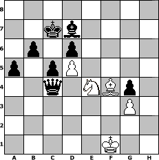 Partie-Notation im PGN-Format [Event "Turnier in den M"] [Site "www.mySchach.de"] [Date "2014.02.19"] [Round "1"] [White "alpacino"] [Black "Macks"] [ECO "B23"] [WhitemyELO "1304"] [BlackmyELO "1372"] [Result "0-1"] [TimeControl "10/2592000"] [WhiteDays "30"] [BlackDays "30"] [MySchachNr "93076"] 1. e4 c5 2. Nc3 Nc6 3. Nf3 g6 4. Bc4 Bg7 5. Bxf7+ Kxf7 6. Ng5+ Ke8 7. Qf3 Nf6 8. Nd5 Nd4 9. Qc3 b6 10. d3 Nxd5 11. exd5 Nf3+ 12. Nxf3 Bxc3+ 13. bxc3 Bb7 14. c4 d6 15. O-O Qd7 16. Bb2 Rg8 17. Rfe1 Kd8 18. a3 Kc7 19. Bc3 Raf8 20. Re3 Re8 21. Bb2 e5 22. Bc3 g5 23. a4 a5 24. Re4 g4 25. Nd2 Qf5 26. g3 Ref8 27. Rf1 Rf6 28. Re2 h5 29. Ne4 Rh6 30. Rd2 Bc8 31. Bb2 h4 32. Re2 Qh5 33. Bc3 hxg3 34. fxg3 Bf5 35. Nd2 Rgh8 36. Rff2 Qf7 37. Nf1 Qh7 38. Bd2 Rh5 39. Be3 e4 40. dxe4 Bxe4 41. Bc1 Re8 42. c3 Qg6 43. Bf4 Bd3 44. Rxe8 Qxe8 45. Nd2 Bc2 46. Nf1 Bxa4 47. Nd2 Bd7 48. Kg2 Qh8 49. Ne4 Rxh2+ 50. Kf1 Rxf2+ 51. Nxf2 Qxc3 52. Ne4 Qxc4+ 0-1 Stellungs-Notation im FEN-Format 8/2kb4/1p1p4/p1pP4/2q1NBp1/6P1/8/5K2 - - - 0 53 Geschlagene Figuren Weiss: Geschlagene Figuren Schwarz: Klicken Sie auf eine geschlagene Figur um den gewünschten Zug darzustellen!