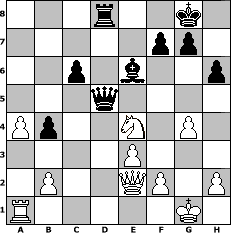 Partie-Notation im PGN-Format [Event "Winteranfang 2017"] [Site "www.mySchach.de"] [Date "2017.12.21"] [Round "1"] [White "Helmut48"] [Black "jeremyt"] [ECO "E11"] [WhitemyELO "1974"] [BlackmyELO "2129"] [Result "1/2-1/2"] [TimeControl "10/3456000"] [WhiteDays "40"] [BlackDays "40"] [MySchachNr "110757"] 1. d4 Nf6 2. c4 e6 3. Nf3 Bb4+ 4. Bd2 a5 5. g3 d5 6. Qc2 c5 7. cxd5 cxd4 8. Nxd4 O-O 9. Bg2 Qb6 10. e3 exd5 11. O-O Nc6 12. Nxc6 bxc6 13. Bc3 Ne4 14. Bxe4 dxe4 15. Bxb4 axb4 16. Nd2 h6 17. Rfc1 Rd8 18. Nb3 Rd3 19. Nc5 Rd5 20. a4 Bh3 21. Nxe4 Bf5 22. Qc4 Be6 23. Qe2 Rad8 24. g4 Qc7 25. Rc5 Qe5 26. Rxd5 Qxd5 27. Ng3 Qb3 28. Ne4 Qd5 29. Ng3 Qb3 30. Ne4 Qd5 1/2-1/2 Stellungs-Notation im FEN-Format 3r2k1/5pp1/2p1b2p/3q4/Pp2N1P1/4P3/1P2QP1P/R5K1 - - - 8 31 Geschlagene Figuren Weiss: Geschlagene Figuren Schwarz: Klicken Sie auf eine geschlagene Figur um den gewünschten Zug darzustellen!
