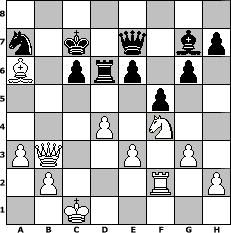 Partie-Notation im PGN-Format [Event "Alapin-Diemer-Gambit Thematurnier"] [Site "www.mySchach.de"] [Date "2010.01.23"] [Round "1"] [White "muellerh"] [Black "Seneca"] [ECO "C01"] [WhitemyELO "1484"] [BlackmyELO "1534"] [Result "1-0"] [TimeControl "10/2592000"] [WhiteDays "56"] [BlackDays "78"] [MySchachNr "62553"] 1. e4 e6 2. d4 d5 3. Be3 dxe4 4. Bc4 Nf6 5. a3 Nd5 6. Ne2 g6 7. Nbc3 Nxe3 8. fxe3 Qg5 9. Nf4 Bg7 10. Nxe4 Qh4+ 11. g3 Qe7 12. Qd2 Nc6 13. O-O-O a6 14. Qd3 b5 15. Bb3 Bb7 16. Rhf1 O-O-O 17. Nc5 Na7 18. Nxb7 Kxb7 19. c4 bxc4 20. Bxc4 Rd6 21. Qe4+ c6 22. Rd3 Re8 23. Rb3+ Kc7 24. Bxa6 Rb8 25. Rxb8 Kxb8 26. Rf2 f5 27. Qd3 Kc7 28. Qb3 1-0 Stellungs-Notation im FEN-Format 8/n1k1q1bp/B1prp1p1/5p2/3P1N2/PQ2P1P1/1P3R1P/2K5 - - - 3 28 Geschlagene Figuren Weiss: Geschlagene Figuren Schwarz: Klicken Sie auf eine geschlagene Figur um den gewünschten Zug darzustellen!