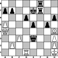 Partie-Notation im PGN-Format [Event "Vorweihnachtsturnier"] [Site "www.mySchach.de"] [Date "2010.11.23"] [Round "1"] [White "Joschi"] [Black "haggard"] [ECO "A04"] [WhitemyELO "1612"] [BlackmyELO "1845"] [Result "0-1"] [TimeControl "10/3456000"] [WhiteDays "118"] [BlackDays "120"] [MySchachNr "70019"] 1. Nf3 f5 2. e4 fxe4 3. Ng5 Nf6 4. Nc3 d5 5. d3 h6 6. N5h3 Bxh3 7. gxh3 exd3 8. Bxd3 e6 9. Bg6+ Kd7 10. O-O Bd6 11. Nb5 Nc6 12. Nxd6 cxd6 13. Bf4 e5 14. Bg3 Qb6 15. a4 Rhf8 16. Qd2 Nd4 17. Kh1 Ne4 18. Bxe4 dxe4 19. c3 Nb3 20. Qc2 Nxa1 21. Rxa1 e3 22. fxe3 Qxe3 23. Rd1 Rf7 24. a5 Raf8 25. Qa4+ Ke7 26. Bh4+ g5 0-1 Stellungs-Notation im FEN-Format 5r2/pp2kr2/3p3p/P3p1p1/Q6B/2P1q2P/1P5P/3R3K - - - 0 27 Geschlagene Figuren Weiss: Geschlagene Figuren Schwarz: Klicken Sie auf eine geschlagene Figur um den gewünschten Zug darzustellen!