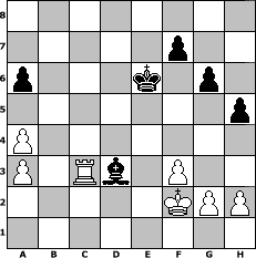 Partie-Notation im PGN-Format [Event "Pott Schach - Gl"] [Site "www.mySchach.de"] [Date "2016.10.25"] [Round "1"] [White "Helmut48"] [Black "sprinterde"] [ECO "A40"] [WhitemyELO "2030"] [BlackmyELO "1703"] [Result "1-0"] [TimeControl "10/2592000"] [WhiteDays "118"] [BlackDays "118"] [MySchachNr "105374"] 1. d4 e6 2. e4 Nf6 3. e5 Nd5 4. Nf3 c5 5. c3 cxd4 6. cxd4 Bb4+ 7. Bd2 Qb6 8. Na3 Bxa3 9. bxa3 Nc6 10. Rb1 Qd8 11. Bc4 O-O 12. O-O d6 13. Qc2 dxe5 14. dxe5 Re8 15. Ng5 g6 16. Ne4 Nxe5 17. Bxd5 exd5 18. Bg5 Re7 19. Qd2 Ng4 20. Nf6+ Nxf6 21. Bxf6 Qf8 22. Bxe7 Qxe7 23. Qxd5 Rb8 24. Qa5 b6 25. Qb4 Qg5 26. Qd6 Rb7 27. Qc6 Qc5 28. Qxc5 bxc5 29. Rxb7 Bxb7 30. Rc1 a6 31. Rxc5 Be4 32. f3 Bd3 33. Kf2 Kf8 34. a4 h5 35. a3 Ke7 36. Rc7+ Ke6 37. Rc3 1-0 Stellungs-Notation im FEN-Format 8/5p2/p3k1p1/7p/P7/P1Rb1P2/5KPP/8 - - - 4 37 Geschlagene Figuren Weiss: Geschlagene Figuren Schwarz: Klicken Sie auf eine geschlagene Figur um den gewünschten Zug darzustellen!