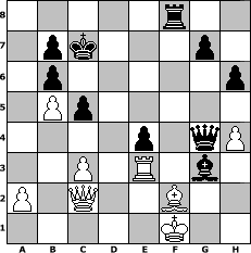 Partie-Notation im PGN-Format [Event "Bremer Schl"] [Site "www.mySchach.de"] [Date "2008.11.01"] [Round "1"] [White "martinus"] [Black "deepsabel"] [ECO "C55"] [WhitemyELO "1928"] [BlackmyELO "1924"] [Result "0-1"] [TimeControl "10/2592000"] [WhiteDays "108"] [BlackDays "118"] [MySchachNr "49390"] 1. e4 e5 2. Nf3 Nc6 3. Bc4 Nf6 4. Nc3 Nxe4 5. O-O Nxc3 6. dxc3 h6 7. Qd5 Qf6 8. Re1 d6 9. Bb5 Bd7 10. Nd4 Nd8 11. Bxd7+ Kxd7 12. Nf3 c6 13. Qa5 Ne6 14. Be3 Be7 15. Rad1 Kc8 16. b4 Qg6 17. b5 c5 18. Nd2 Qxc2 19. Nc4 Rd8 20. Nb6+ axb6 21. Qxa8+ Kc7 22. Qa3 d5 23. Rc1 Qg6 24. Rcd1 f5 25. f3 f4 26. Bf2 Ng5 27. Kf1 e4 28. Qa4 Bd6 29. Qc2 Qh5 30. fxe4 f3 31. h4 fxg2+ 32. Kxg2 Qg4+ 33. Kf1 Qh3+ 34. Ke2 Nxe4 35. Rd3 Qg4+ 36. Kf1 Rf8 37. Rxe4 dxe4 38. Re3 Bg3 0-1 Stellungs-Notation im FEN-Format 5r2/1pk3p1/1p5p/1Pp5/4p1qP/2P1R1b1/P1Q2B2/5K2 - - - 2 39 Geschlagene Figuren Weiss: Geschlagene Figuren Schwarz: Klicken Sie auf eine geschlagene Figur um den gewünschten Zug darzustellen!