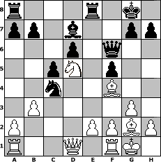 Partie-Notation im PGN-Format [Event "Einstand"] [Site "www.mySchach.de"] [Date "2010.12.10"] [Round "2"] [White "Duschgel"] [Black "Haki"] [ECO "A21"] [WhitemyELO "1549"] [BlackmyELO "1315"] [Result "1-0"] [TimeControl "10/864000"] [WhiteDays "10"] [BlackDays "10"] [MySchachNr "70502"] 1. c4 e5 2. Nc3 Bb4 3. Nd5 Be7 4. g3 Nf6 5. Nxe7 Qxe7 6. Bg2 O-O 7. Nf3 e4 8. Nd4 c5 9. Nc2 Nc6 10. O-O d6 11. d3 Bf5 12. Ne3 Bd7 13. dxe4 Nxe4 14. Nd5 Qd8 15. Bxe4 Re8 16. Bg2 f5 17. Bf4 Ne5 18. Nc3 Nxc4 19. b3 Qf6 20. Nd5 1-0 Stellungs-Notation im FEN-Format r3r1k1/pp1b2pp/3p1q2/2pN1p2/2n2B2/1P4P1/P3PPBP/R2Q1RK1 - - - 2 20 Geschlagene Figuren Weiss: Geschlagene Figuren Schwarz: Klicken Sie auf eine geschlagene Figur um den gewünschten Zug darzustellen!