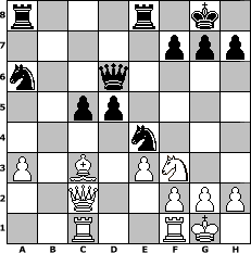 Partie-Notation im PGN-Format [Event "D.A. - Schnell 1"] [Site "www.mySchach.de"] [Date "2008.06.09"] [Round "1"] [White "brucybabe"] [Black "katschestwo"] [ECO "E21"] [WhitemyELO "1629"] [BlackmyELO "1867"] [Result "1-0"] [TimeControl "10/864000"] [WhiteDays "08"] [BlackDays "00"] [MySchachNr "45501"] 1. d4 Nf6 2. c4 e6 3. Nc3 Bb4 4. Nf3 d5 5. e3 O-O 6. Bd2 b6 7. a3 Bxc3 8. Bxc3 a5 9. cxd5 exd5 10. Rc1 Ne4 11. Be2 Ba6 12. Bxa6 Nxa6 13. O-O Re8 14. Qc2 Qd6 15. b4 axb4 16. Bxb4 c5 17. dxc5 bxc5 18. Bc3 1-0 Stellungs-Notation im FEN-Format r3r1k1/5ppp/n2q4/2pp4/4n3/P1B1PN2/2Q2PPP/2R2RK1 - - - 1 18 Geschlagene Figuren Weiss: Geschlagene Figuren Schwarz: Klicken Sie auf eine geschlagene Figur um den gewünschten Zug darzustellen!