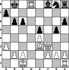 Partie-Notation im PGN-Format [Event "wie w"] [Site "www.mySchach.de"] [Date "2013.11.16"] [Round "1"] [White "Winston"] [Black "lotchi"] [ECO "C20"] [WhitemyELO "1550"] [BlackmyELO "1175"] [Result "1-0"] [TimeControl "10/1728000"] [WhiteDays "20"] [BlackDays "14"] [MySchachNr "91141"] 1. e4 e5 2. a3 d5 3. exd5 Qxd5 4. Nc3 Qd6 5. Qf3 f6 6. Nge2 Nc6 7. Ng3 g6 8. Bb5 Bd7 9. d3 O-O-O 10. Be3 h6 11. Nge4 Qe7 12. Nd5 Qf7 13. Bc4 f5 14. Nb6+ cxb6 15. Bxf7 fxe4 16. dxe4 g5 17. O-O-O Be8 18. Be6+ Bd7 19. Bxd7+ Kb8 20. Bxc6 bxc6 21. Rxd8+ 1-0 Stellungs-Notation im FEN-Format 1k1R1bnr/p7/1pp4p/4p1p1/4P3/P3BQ2/1PP2PPP/2K4R - - - 0 21 Geschlagene Figuren Weiss: Geschlagene Figuren Schwarz: Klicken Sie auf eine geschlagene Figur um den gewünschten Zug darzustellen!