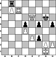 Partie-Notation im PGN-Format [Event "Es wird Fr"] [Site "www.mySchach.de"] [Date "2009.03.13"] [Round "2"] [White "kalle"] [Black "Andreas"] [ECO "D31"] [WhitemyELO "1677"] [BlackmyELO "1579"] [Result "1-0"] [TimeControl "10/2592000"] [WhiteDays "122"] [BlackDays "136"] [MySchachNr "53804"] 1. d4 d5 2. c4 e6 3. Nc3 c6 4. Nf3 Nf6 5. e3 Bb4 6. Bd2 O-O 7. a3 Bxc3 8. Bxc3 Nbd7 9. b4 Ne4 10. Bb2 a6 11. c5 b6 12. cxb6 Nxb6 13. Qc2 Bb7 14. Bd3 Nf6 15. O-O h6 16. Rfc1 Rc8 17. Qe2 Na4 18. Ra2 Nxb2 19. Rxb2 a5 20. bxa5 Ba8 21. Ba6 Rc7 22. Ne5 Ne4 23. f3 Nd6 24. Bd3 f5 25. a6 g5 26. Rbc2 Kg7 27. Nxc6 Bxc6 28. Rxc6 Ra7 29. a4 Qd7 30. Bb5 Nxb5 31. axb5 Kg6 32. b6 Raa8 33. b7 Rab8 34. Rc7 Qd6 35. R1c6 Qxc7 36. Rxc7 h5 37. a7 g4 38. axb8=Q Rxb8 39. Qa6 gxf3 40. Qxe6+ 1-0 Stellungs-Notation im FEN-Format 1r6/1PR5/4Q1k1/3p1p1p/3P4/4Pp2/6PP/6K1 - - - 0 40 Geschlagene Figuren Weiss: Geschlagene Figuren Schwarz: Klicken Sie auf eine geschlagene Figur um den gewünschten Zug darzustellen!