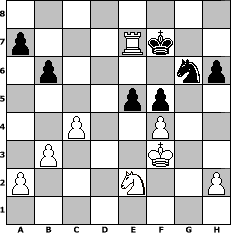 Partie-Notation im PGN-Format [Event "Bremer Schl"] [Site "www.mySchach.de"] [Date "2008.11.01"] [Round "1"] [White "Dragonwolves"] [Black "Fighter"] [ECO "A46"] [WhitemyELO "2163"] [BlackmyELO "2087"] [Result "1/2-1/2"] [TimeControl "10/2592000"] [WhiteDays "139"] [BlackDays "115"] [MySchachNr "49385"] 1. d4 Nf6 2. Nf3 e6 3. c4 b6 4. g3 Ba6 5. b3 Bb4+ 6. Bd2 Be7 7. Bg2 c6 8. Bc3 d5 9. Nbd2 Nbd7 10. O-O O-O 11. Re1 c5 12. e4 dxe4 13. Nxe4 Bb7 14. Nfg5 cxd4 15. Bxd4 Qc7 16. Nxf6+ Bxf6 17. Bxb7 Qxb7 18. Ne4 Bxd4 19. Qxd4 Rad8 20. Rad1 Qa8 21. Qc3 Nb8 22. Rd3 Rxd3 23. Qxd3 h6 24. Rd1 Nc6 25. Nd6 Ne5 26. Qe4 Qxe4 27. Nxe4 f5 28. Nc3 g5 29. f4 gxf4 30. gxf4 Ng6 31. Ne2 Re8 32. Rd7 Re7 33. Rd8+ Kf7 34. Kf2 Rc7 35. Rd4 Re7 36. Rd1 Kf6 37. Ke3 e5 38. Rd6+ Kf7 39. Kf3 Re6 40. Rd7+ Re7 41. Rxe7+ 1/2-1/2 Stellungs-Notation im FEN-Format 8/p3Rk2/1p4np/4pp2/2P2P2/1P3K2/P3N2P/8 - - - 0 41 Geschlagene Figuren Weiss: Geschlagene Figuren Schwarz: Klicken Sie auf eine geschlagene Figur um den gewünschten Zug darzustellen!
