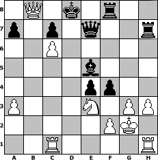 Partie-Notation im PGN-Format [Event "YOUR LAST BREATH"] [Site "www.mySchach.de"] [Date "2019.11.17"] [Round "2"] [White "martinus"] [Black "wolni55"] [ECO "A00"] [WhitemyELO "1718"] [BlackmyELO "1359"] [Result "1-0"] [TimeControl "10/3456000"] [WhiteDays "40"] [BlackDays "39"] [MySchachNr "116373"] 1. b4 e5 2. Bb2 Bxb4 3. Bxe5 f6 4. Bb2 d5 5. a3 Ba5 6. c3 Bd7 7. Nf3 Nc6 8. g3 Qe7 9. Bg2 Be6 10. O-O O-O-O 11. d4 h5 12. Nbd2 g5 13. e4 Bg4 14. h3 Bxf3 15. Bxf3 dxe4 16. Re1 f5 17. Bxh5 Nf6 18. Nc4 Rxh5 19. Kg2 Qh7 20. Rh1 Qd7 21. Ne3 Rdh8 22. c4 Rf8 23. d5 Ne7 24. Bxf6 Rh7 25. Bxg5 Bc3 26. Rc1 Be5 27. c5 Kb8 28. c6 bxc6 29. Qb3+ Kc8 30. Bxe7 Qxe7 31. dxc6 f4 32. Qb7+ Kd8 33. Qb8# 1-0 Stellungs-Notation im FEN-Format 1Q1k1r2/p1p1q2r/2P5/4b3/4pp2/P3N1PP/5PK1/2R4R - - - 3 33 Geschlagene Figuren Weiss: Geschlagene Figuren Schwarz: Klicken Sie auf eine geschlagene Figur um den gewünschten Zug darzustellen!