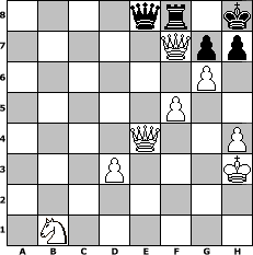 Partie-Notation im PGN-Format [Event "Die magische 69 !"] [Site "www.mySchach.de"] [Date "2012.02.18"] [Round "1"] [White "Erich"] [Black "Lemmi11"] [Variant "Fischerrandom"] [SetUp "1"] [FEN "nnbbrkqr/pppppppp/8/8/8/8/PPPPPPPP/NNBBRKQR w KQkq - 0 1"] [WhitemyELO "1993"] [BlackmyELO "1827"] [Result "1-0"] [TimeControl "10/2592000"] [WhiteDays "180"] [BlackDays "180"] [MySchachNr "80037"] 1. Nc3 f5 2. d3 Nb6 3. e4 Qf7 4. exf5 O-O 5. h4 d5 6. g4 e6 7. fxe6 Rxe6 8. Rxe6 Qxe6 9. f4 Qf7 10. Nb3 Nc6 11. Qg3 a5 12. O-O a4 13. Nc5 Qf6 14. g5 Qd6 15. N5xa4 Nxa4 16. Nxa4 Ne7 17. c4 Be6 18. cxd5 Bxd5 19. Nac3 Nf5 20. Qf2 Bc6 21. Bg4 Be7 22. Rd1 Nd4 23. Re1 Bd7 24. Bd1 Kh8 25. a3 c5 26. Be3 Bf5 27. Ne4 Qd8 28. b4 b6 29. bxc5 Bxc5 30. Nxc5 bxc5 31. Bxd4 cxd4 32. Bf3 Qd6 33. Be4 Qc5 34. Qb2 Rd8 35. Kg2 Bd7 36. Qb4 Qc7 37. Kg3 Bc8 38. Bd5 Qd7 39. Be6 Qc7 40. Bxc8 Qxc8 41. Qb6 Rg8 42. Qxd4 Rd8 43. Qe4 Qd7 44. Re3 Qf7 45. a4 Rg8 46. a5 Rf8 47. a6 Rg8 48. Qb7 Qa2 49. a7 Qa1 50. Re7 Qg1+ 51. Qg2 Qa1 52. Qf3 Qg1+ 53. Kh3 Qc5 54. a8=Q Qxe7 55. Qab7 Qe8 56. f5 Qe5 57. Qf7 Qe8 58. g6 Rf8 59. Qe4 1-0 Stellungs-Notation im FEN-Format 4qr1k/5Qpp/6P1/5P2/4Q2P/3P3K/8/1N6 - - - 2 59 Geschlagene Figuren Weiss: Geschlagene Figuren Schwarz: Klicken Sie auf eine geschlagene Figur um den gewünschten Zug darzustellen!