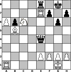Partie-Notation im PGN-Format [Event "9erD"] [Site "www.mySchach.de"] [Date "2010.11.09"] [Round "1"] [White "reiner"] [Black "brucybabe"] [ECO "B33"] [WhitemyELO "1667"] [BlackmyELO "1668"] [Result "1-0"] [TimeControl "10/3456000"] [WhiteDays "40"] [BlackDays "40"] [MySchachNr "69676"] 1. e4 c5 2. Nf3 Nc6 3. d4 cxd4 4. Nxd4 Nf6 5. Nc3 d6 6. Bb5 Bd7 7. O-O e6 8. Bg5 Be7 9. Nb3 O-O 10. Bxf6 Bxf6 11. Qxd6 Bxc3 12. bxc3 Qb6 13. a4 Rac8 14. Qxd7 Rfd8 15. Bxc6 Rxd7 16. Bxd7 Rxc3 17. Rfd1 Rxc2 18. Nd4 Rc4 19. a5 Qc7 20. Nxe6 Qe5 21. a6 b6 22. Bb5 Rc8 23. Nd4 Qxe4 24. Nc6 Ra8 25. Rd7 g6 26. Rxa7 Re8 27. Re7 1-0 Stellungs-Notation im FEN-Format 4r1k1/4Rp1p/PpN3p1/1B6/4q3/8/4PPPP/R5K1 - - - 2 27 Geschlagene Figuren Weiss: Geschlagene Figuren Schwarz: Klicken Sie auf eine geschlagene Figur um den gewünschten Zug darzustellen!
